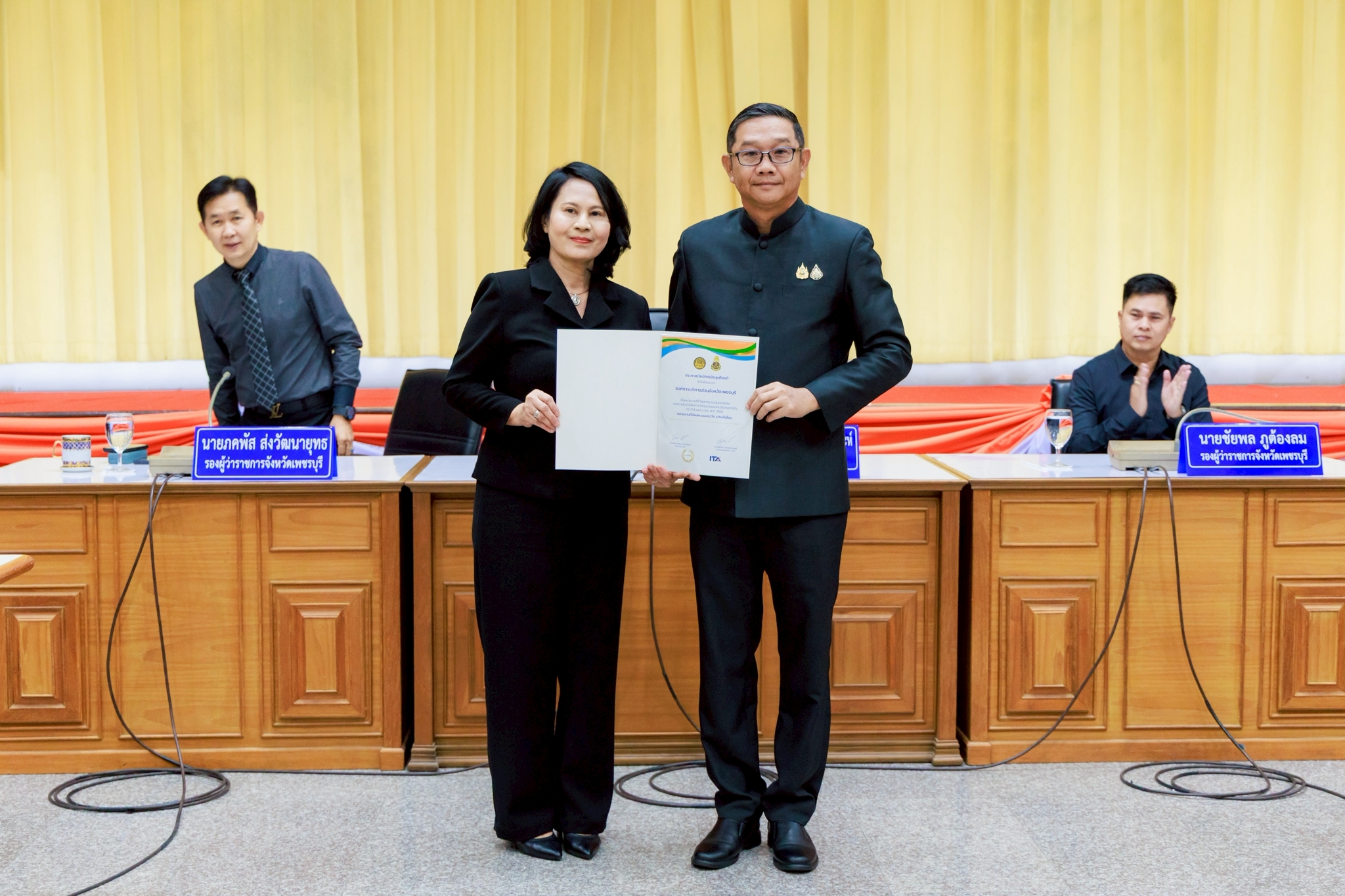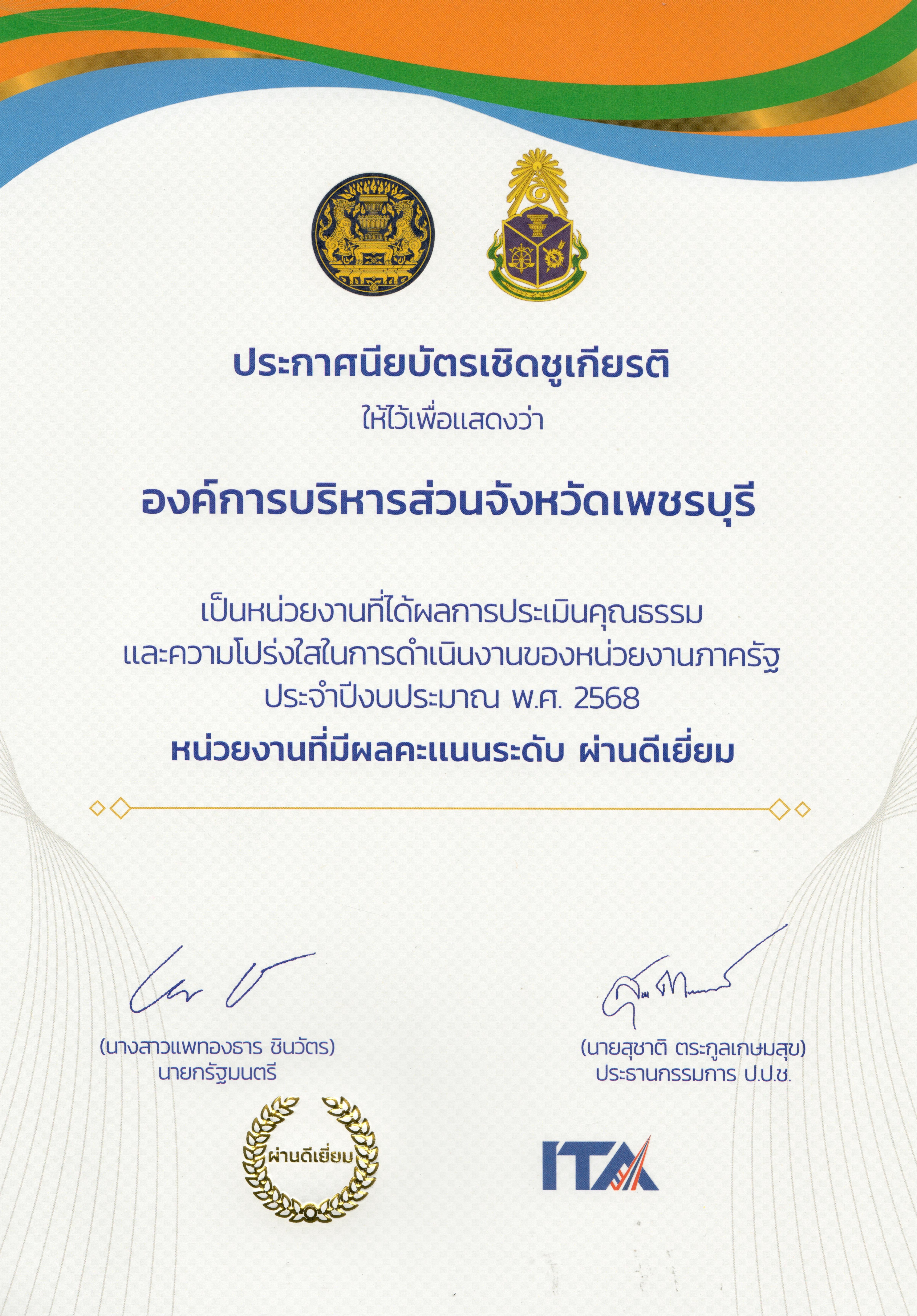 วันที่ 9 ธันวาคม พ.ศ. 2568 นายชัยยะ อังกินันทน์ นายกองค์การบริหารส่วนจังหวัดเพชรบุรี ได้มอบหมายให้ นางจิราพรรณ กลิ่นเกลา รองปลัดองค์การบริหารส่วนจังหวัด รักษาราชการแทน ปลัดองค์การบริหารส่วนจังหวัดเพชรบุรี เป็นตัวแทนเข้ารับมอบ ประกาศนียบัตรเชิดชูเกียรติ ให้ไว้เพื่อแสดงว่า องค์การบริหารส่วนจังหวัดเพชรบุรี เป็นหน่วยงานที่ได้ผลการประเมินคุณธรรมและความโปร่งใสในการดำเนินงานของหน่วยงานภาครัฐ (ITA) ประจำปีงบประมาณ พ.ศ. 2568 หน่วยงานที่มีผลคะแนนระดับ ผ่านดีเยี่ยม จากร้อยตำรวจโท ภพชนก ชลานุเคราะห์ ผู้ว่าราชการจังหวัดเพชรบุรี และเข้าร่วมกิจกรรมวันต่อต้านคอร์รัปชันสากล (ประเทศไทย) จังหวัดเพชรบุรี ณ ห้องประชุมพริบพรี ชั้น 2 อาคารศาลากลางจังหวัดเพชรบุรี